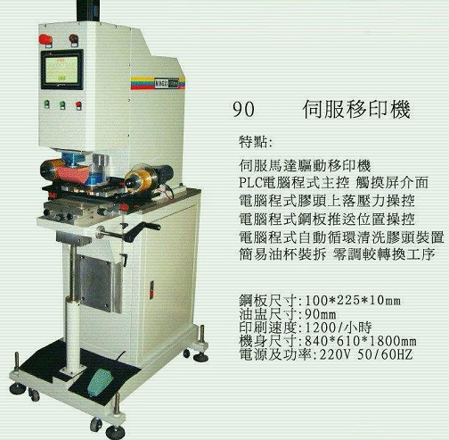b.大型半自動移印機(jī)。大多采用電子電路控制執(zhí)行部件,完成上墨、刮墨、膠頭提墨、再轉(zhuǎn)向工件的全過程。動作的速度和壓力都可調(diào),也可由電腦設(shè)定,按既定要求重復(fù)作業(yè)。