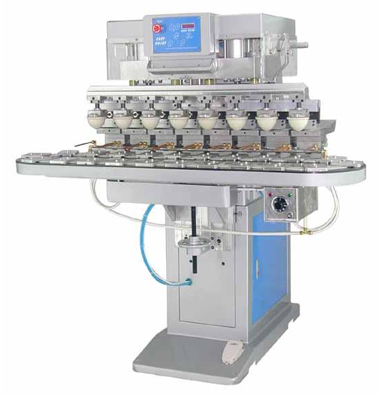 自動(dòng)四色轉(zhuǎn)盤(pán)座地移印機(jī)是一次能夠完成單個(gè)產(chǎn)品四五次套色的機(jī)型,轉(zhuǎn)盤(pán)工作臺(tái)套色精準(zhǔn),不走位