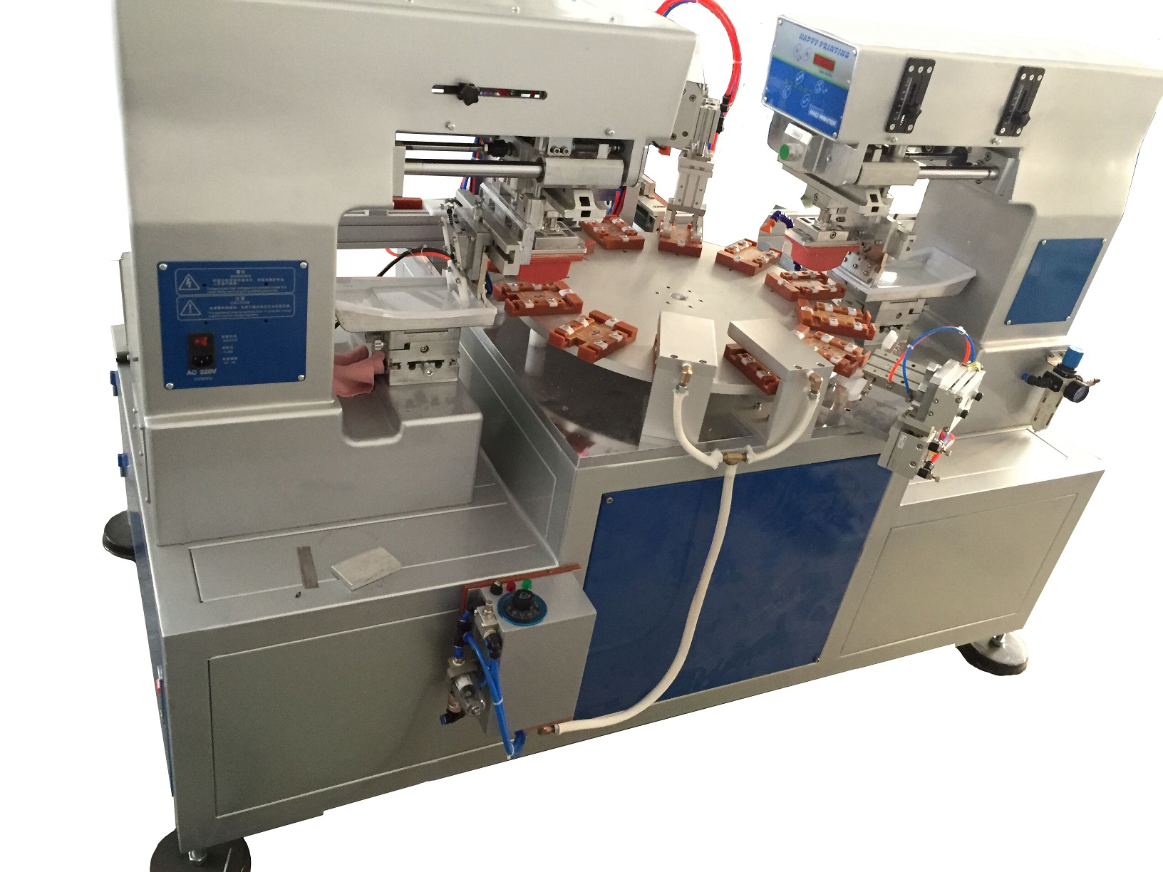 1、 印刷速度比轉(zhuǎn)盤機(jī)慢,但印刷工件可以大一些,四個(gè)顏色一次套色印刷完成。